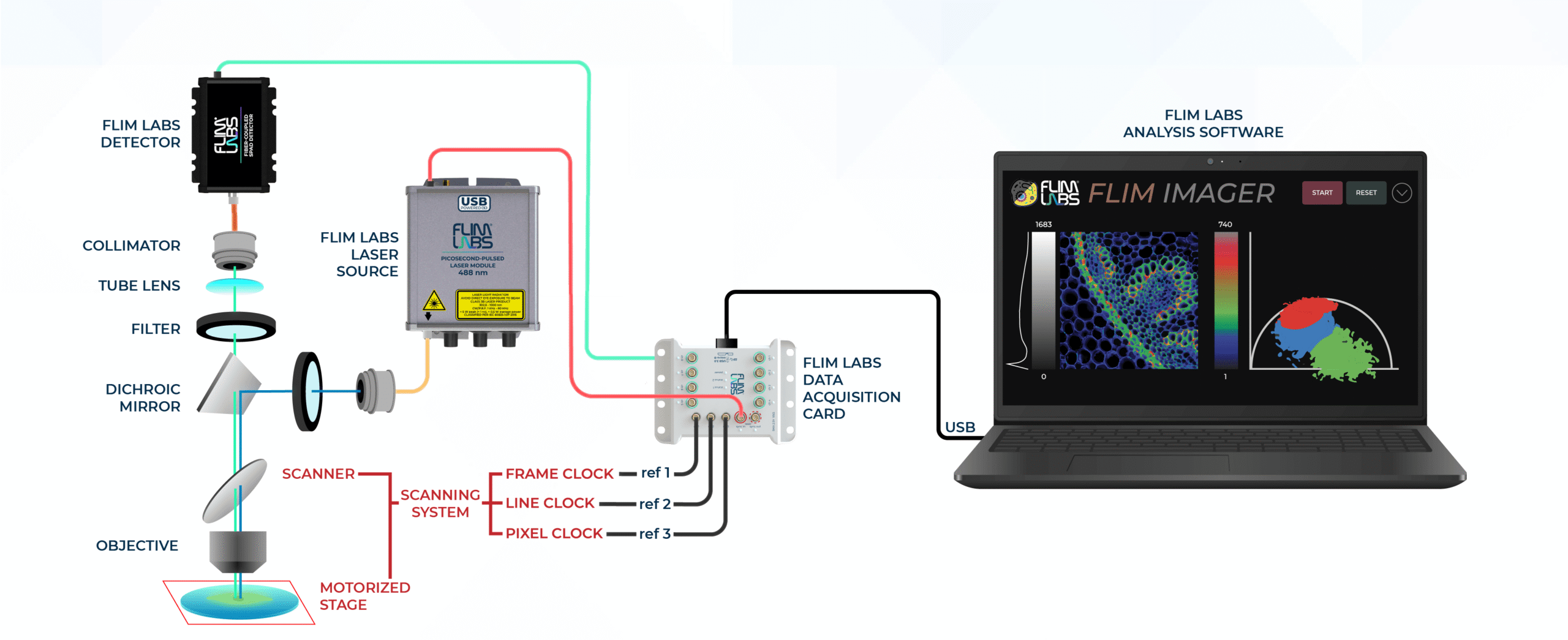 Most commercial Fluorescence Lifetime Imaging point-scanning systems are based on technology developed for a wide range of applications. By adopting a bottom-up design philosophy FLIMLabs have been able to devise a modular system that is specifically optimised only for FLIM, and is consequently much more compact, affordable and user friendly.
